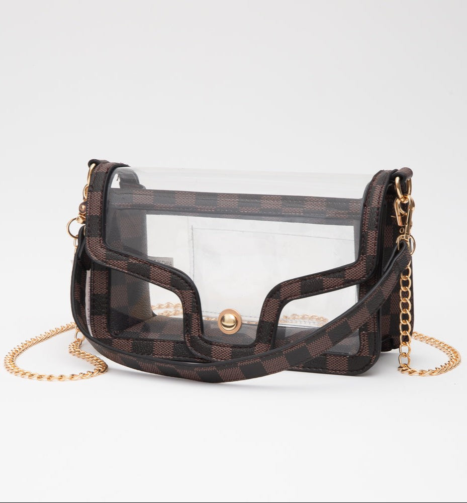 Make every outfit pop with the Clear Couture Checkered Crossbody, your new go-to for stadium events, concerts, or everyday errands. Featuring a sleek transparent body trimmed in a designer-inspired checkered pattern, this clear bag delivers all the high-end energy—without the high price tag.