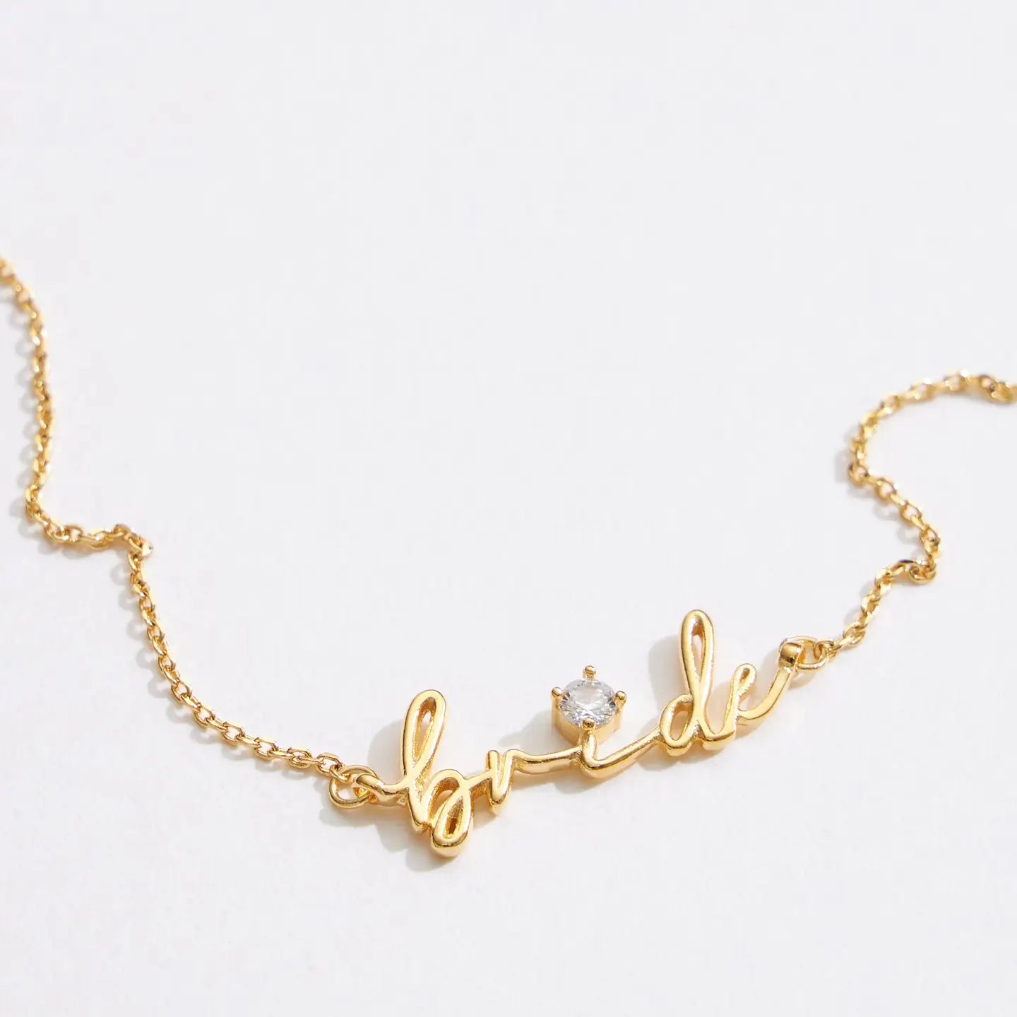 Celebrate your special day with our elegant Gold Dipped Bride Script Necklace — the perfect bridal accessory that combines delicate charm with timeless sophistication. Crafted from 18K gold-dipped brass and adorned with sparkling Cubic Zirconia accents, this necklace features a beautiful script design that spells out “Bride” with grace and style.