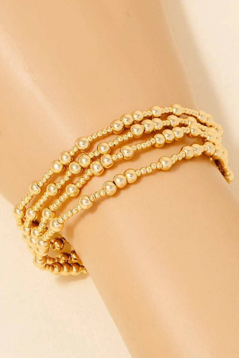 Get ready to stack up some style with our Gold Plated Bead Stack! This stretchy accessory is perfect for adding a touch of glam to any outfit. Embrace your playful side and mix and match with other bracelets to create a unique look. Don't be afraid to have a little fun with your fashion!