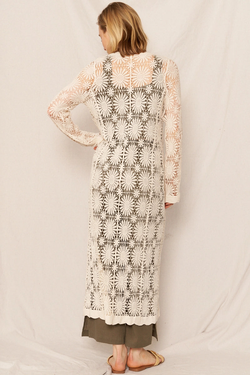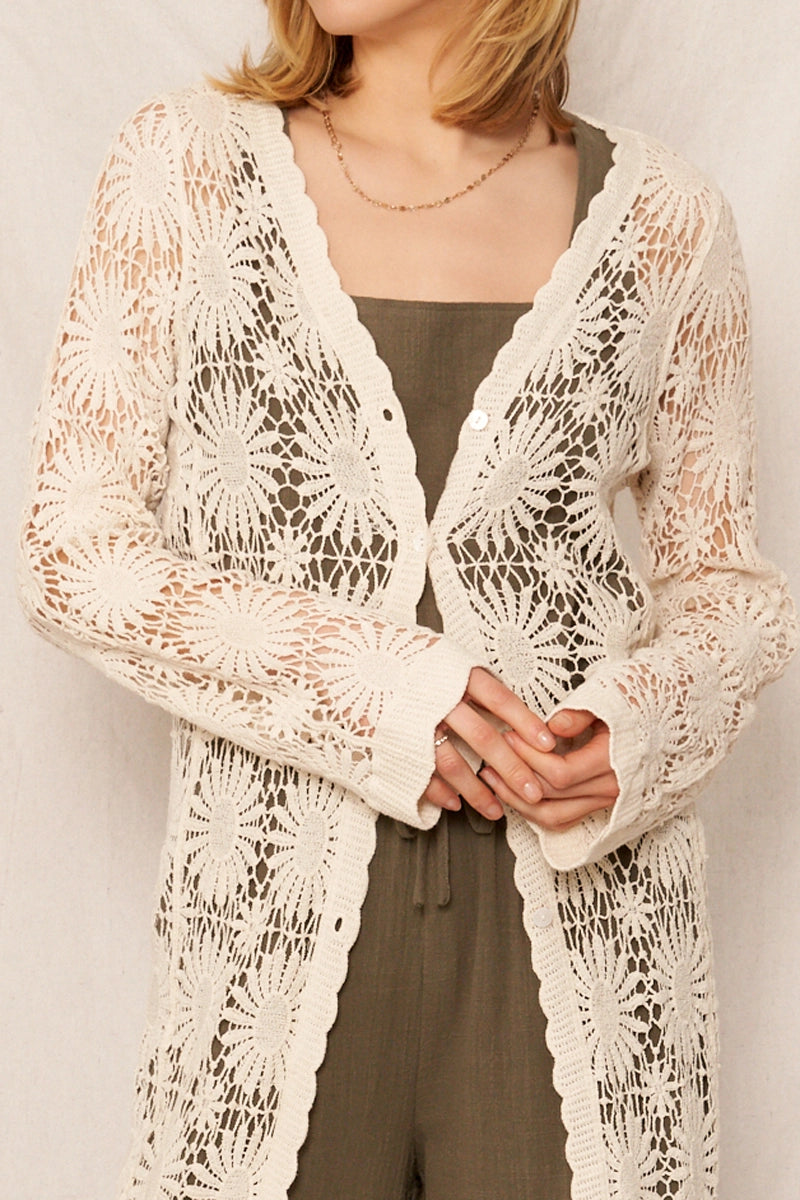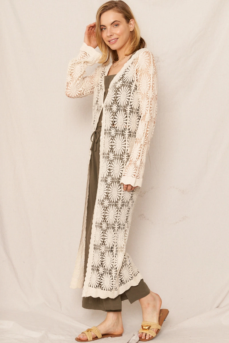 Add a touch of boho-chic elegance to your fall wardrobe with the Harvest Bloom Maxi Cardigan. Crafted in a delicate flower-pattern crochet, this flowy maxi cardigan effortlessly layers over your favorite tops, sweaters, or dresses for an elevated, cozy look.