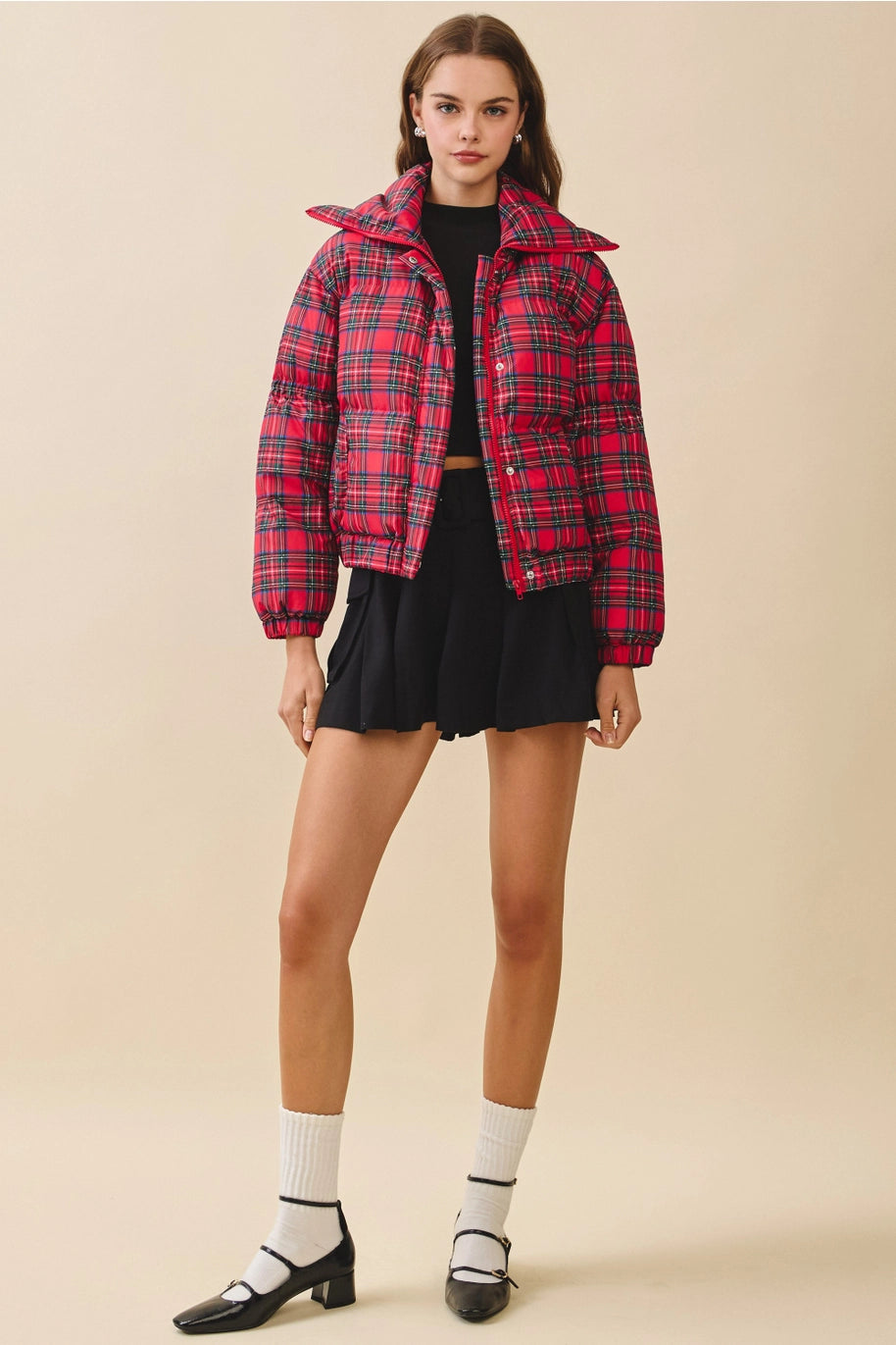 Bring festive charm to your winter wardrobe—shop the Plaid Puffer Jacket and make a statement this season.