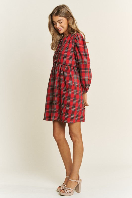 Step into the season in timeless style with The Holly Bow Mini Dress, a festive favorite designed to make every holiday moment picture-perfect. Crafted from soft plaid woven fabric in a rich red tartan, this babydoll mini dress captures the cozy elegance of a RL Christmas aesthetic — classic, chic, and endlessly charming.