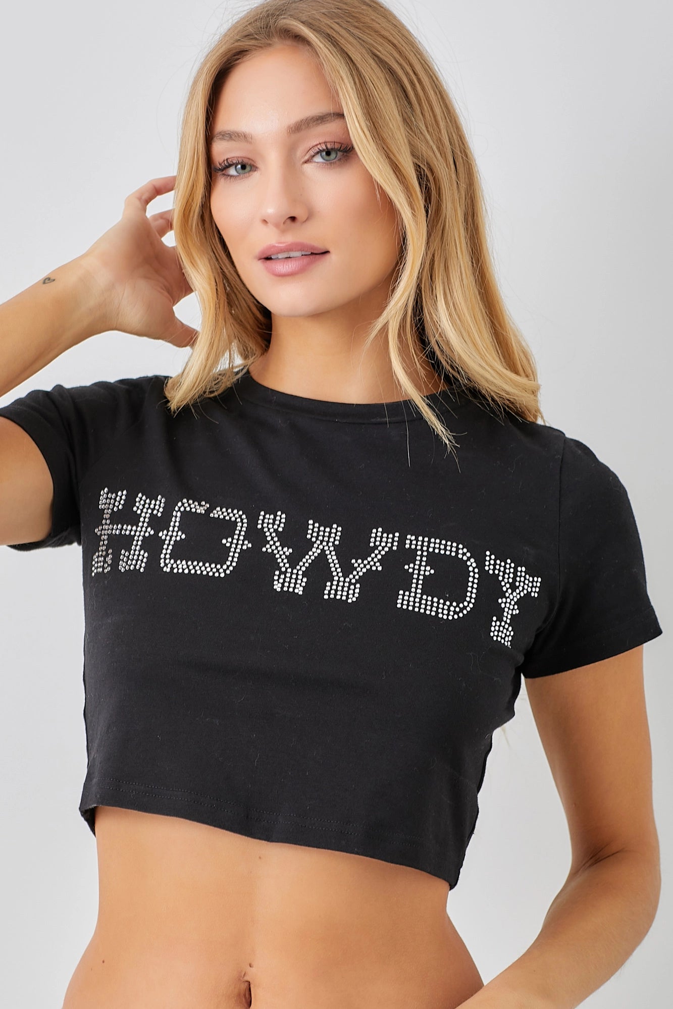 Add a touch of sparkle to your casual wardrobe with the Howdy Rhinestone Baby Tee — the ultimate cute graphic tee for women. Featuring a bold "Howdy" design in sparkling rhinestone accents, this short-sleeve baby tee brings a playful, western-inspired twist to everyday style. Made from soft, breathable fabric, it offers all-day comfort while elevating your look with eye-catching details.