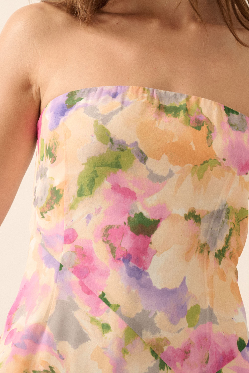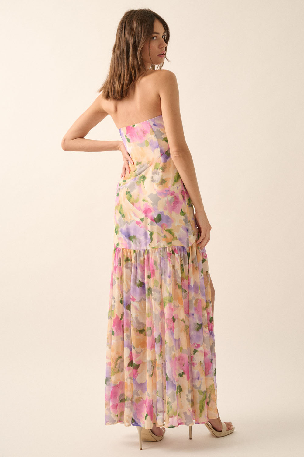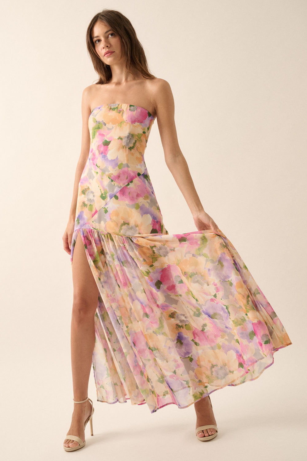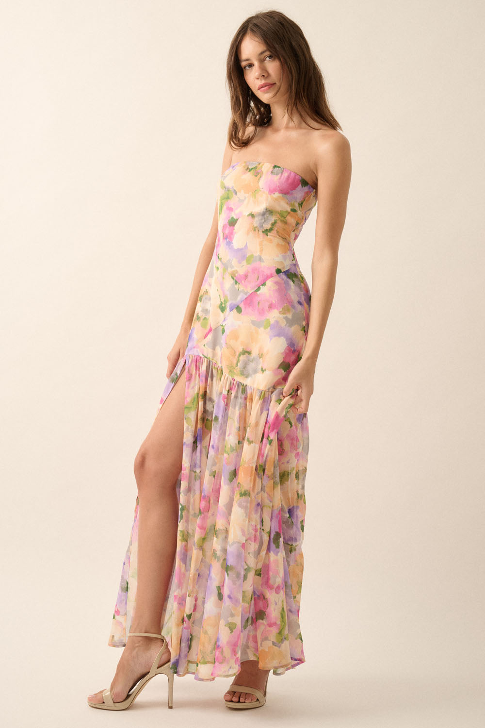 Indulge in timeless elegance with the In Full Bloom Sheer Bottom Maxi Dress—a true masterpiece in luxury and design. Crafted from delicate floral-print chiffon, this enchanting maxi dress embodies the art of refined femininity. The strapless straight neckline and paneled bodice create a sleek, flattering silhouette, while the drop-waist design exudes a sense of effortless sophistication. An asymmetrical skirt flows gracefully, enhanced by a daring side slit that adds just the right amount of allure. The low back completes the look with an air of understated sensuality.