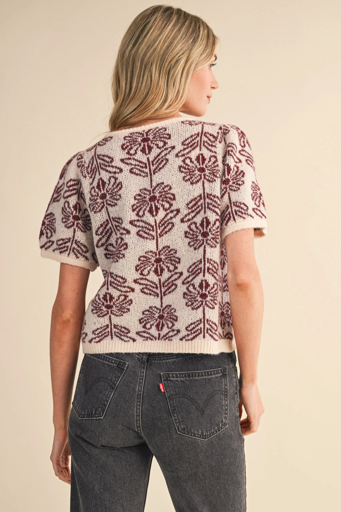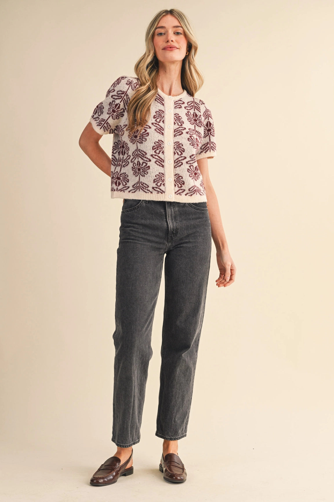Delicate and dreamy, The Marlowe Floral Cardigan brings a fresh, feminine touch to your knitwear collection. Crafted in a soft cream base, this short puff sleeve sweater cardigan features romantic maroon floral knit detailing that adds subtle, elegant contrast.