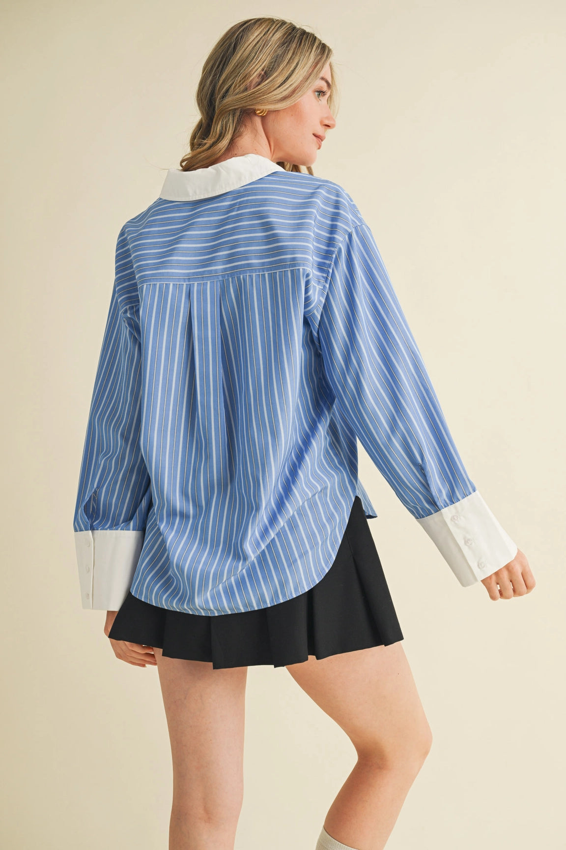 Say hello to your new power piece — The Monroe Power Stripe Shirt is tailored, timeless, and made to move with confidence. Featuring crisp blue vertical stripes, a sharp white collar, and bold wide white cuffs, this button-down was designed to command attention in the chicest way possible.