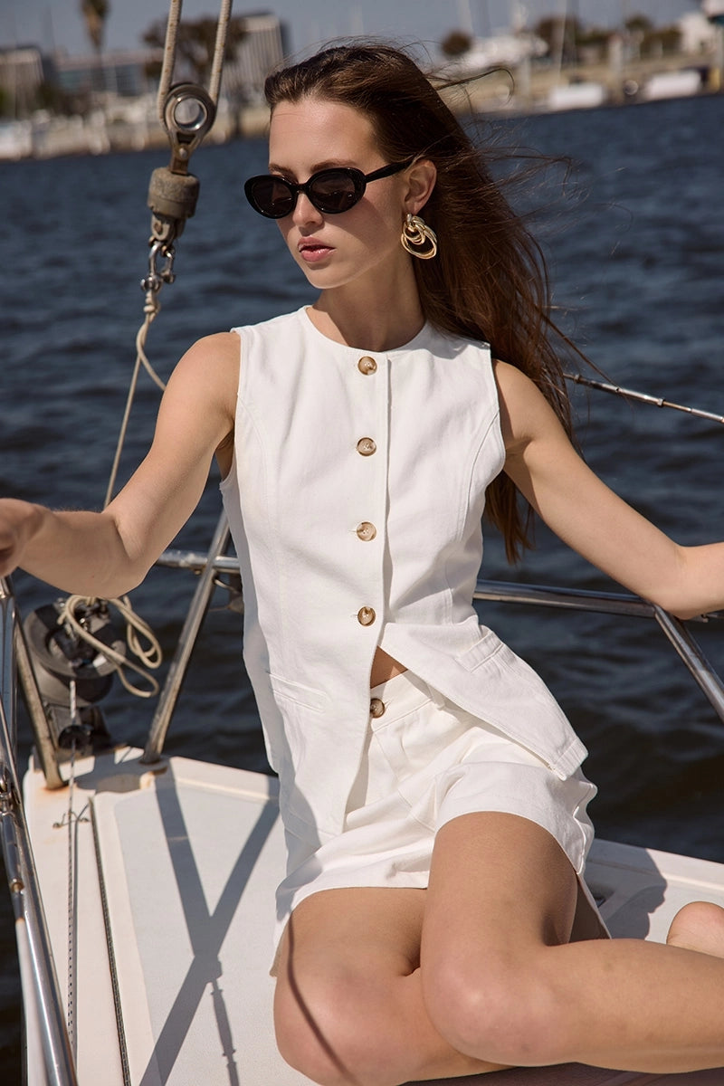 Your new summer obsession just dropped. Meet The Off-Duty Denim Vest – a white-hot, sleeveless vest-style one-piece designed for the effortlessly cool, on-the-go babe. Crafted in crisp white denim, this set serves laid-back luxe with a structured crew neckline, front button-down detailing, and a sleek zipper + button closure shorts that gives you that perfectly snatched waistline.