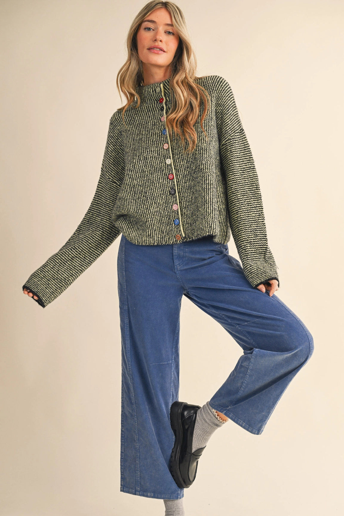 Playful meets cozy in The Oliver Pop Cardigan — a fresh take on a classic knit with just the right pop of personality. Featuring vibrant green stripes and a row of colorful statement buttons, this sweater cardigan adds charm and color to any fall outfit.