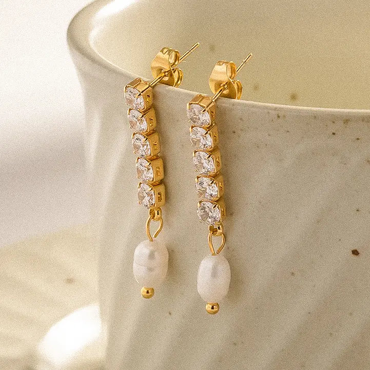 Add a touch of refined elegance to your look with The Selene CZ Pearl Drop Earrings. Featuring a stunning combination of 18K gold plating over durable stainless steel and sparkling cubic zirconia rhinestones, these earrings offer a radiant shine that won’t tarnish or fade.