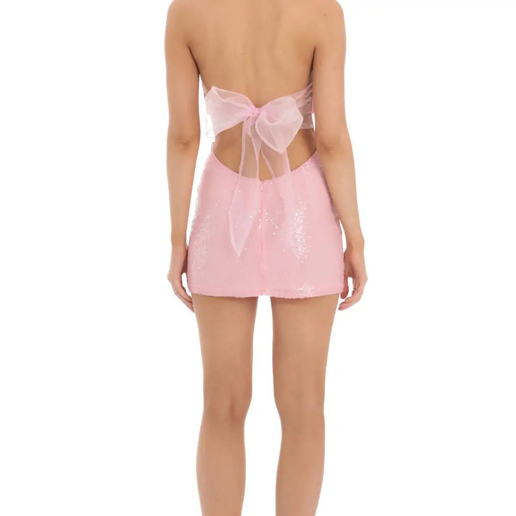 Sequin Strapless Corset Dress in Pink With Bow Back