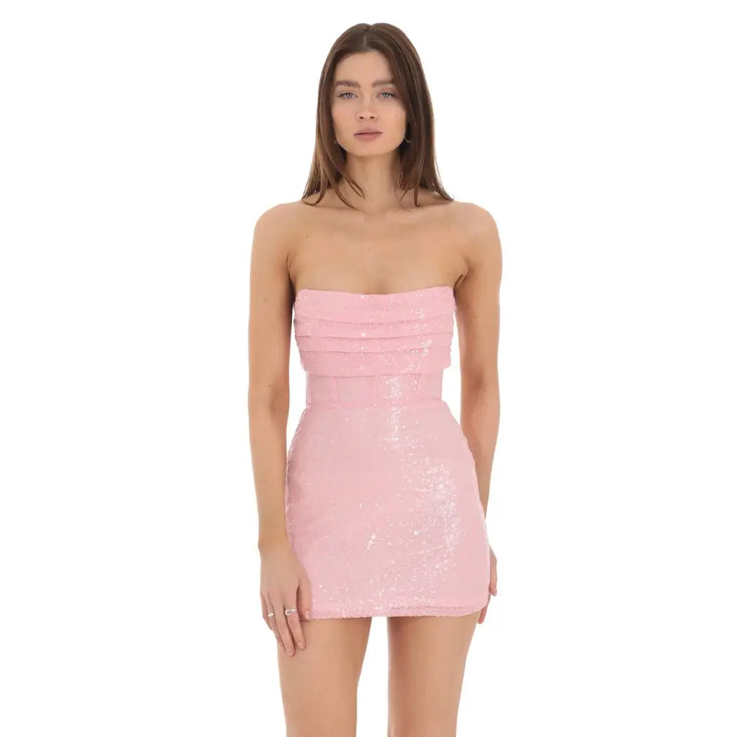 Step into the spotlight with our Sequin Strapless Corset Dress in Pink! The shimmering sequins and flattering corset design will have you feeling like a star. Plus, the playful bow back adds a touch of whimsy to this eye-catching dress. Get ready to make a statement! Lucy In The Sky