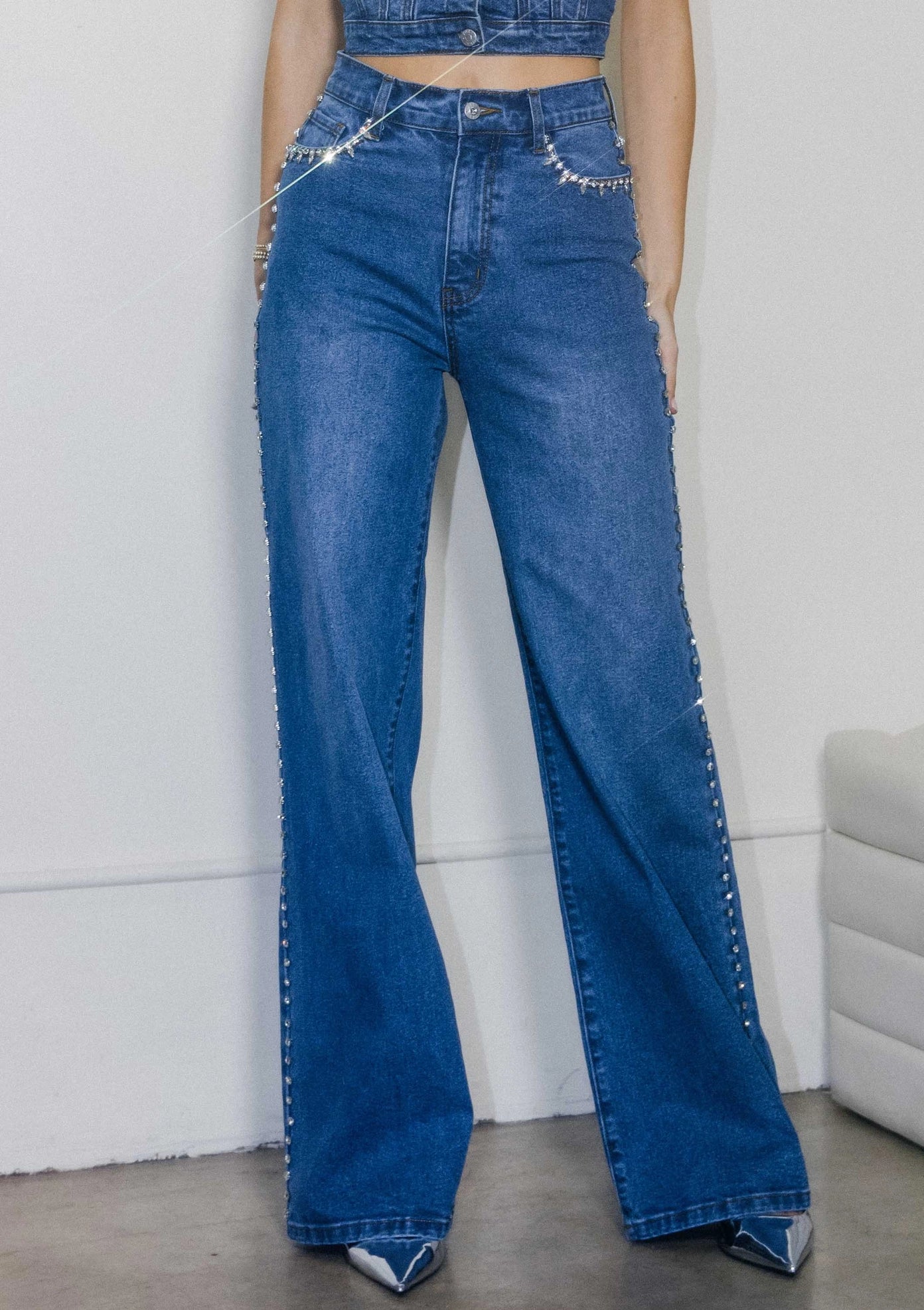 Turn heads and elevate your denim game with our Starlit Studded Wide-Leg Jeans – the ultimate blend of bold, modern glam and vintage flair. Designed for the fashion-forward woman aged 20–40 who isn't afraid to shine, these high-rise jeans are detailed with eye-catching silver studs that trace the side seams for a sleek, elongated silhouette. The ultra-flattering wide-leg cut balances comfort and style, while the premium stretch denim hugs you in all the right places.