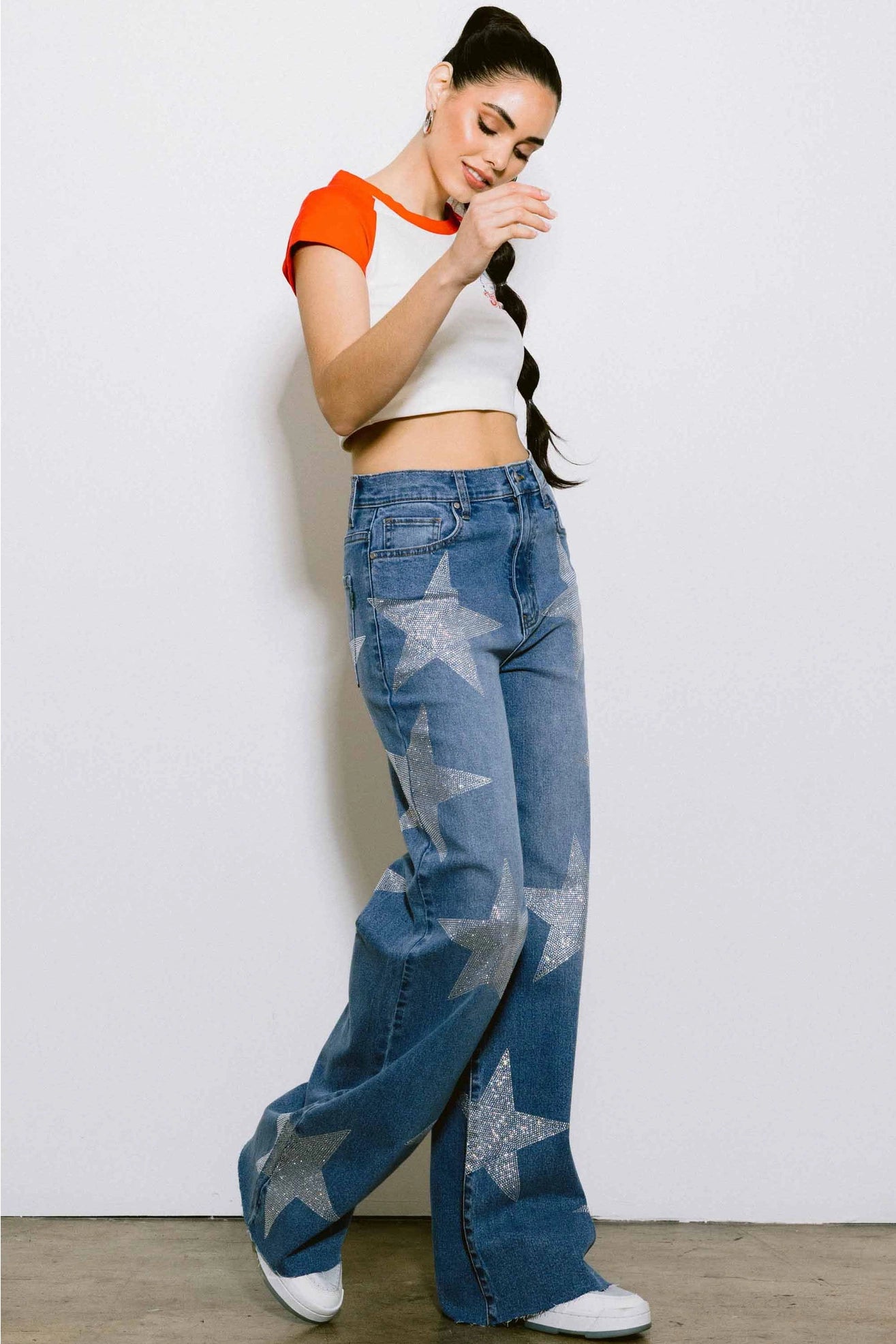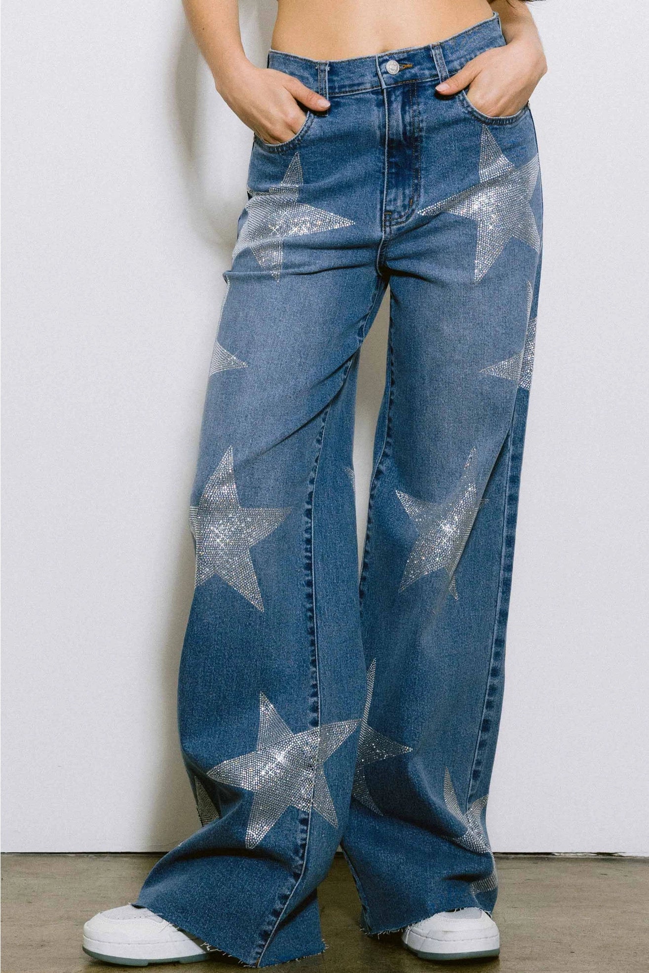 Score major style points this football season with our Starstruck Game Day Glam Jeans! These rhinestone, star-studded wide-leg jeans are the ultimate touchdown for your game day outfit—perfect for tailgates, stadium seats, or cheering from the couch in major style. Designed for bold, confident women who love fashion and football, these jeans combine high-rise comfort with statement sparkle.