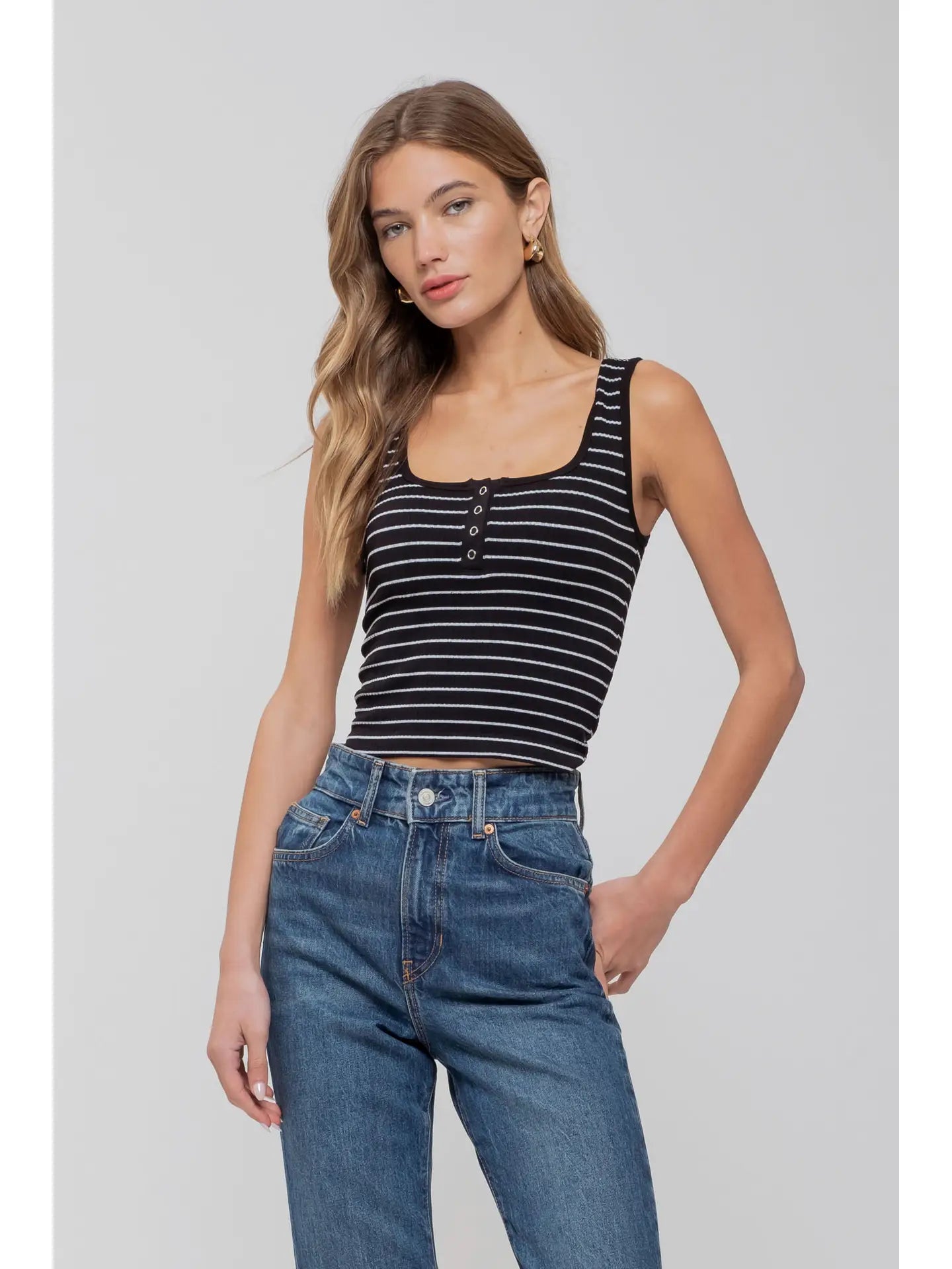 Striped scoop neck henley rib knit tank top