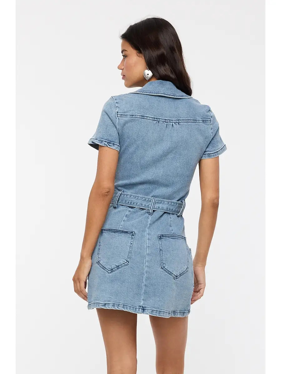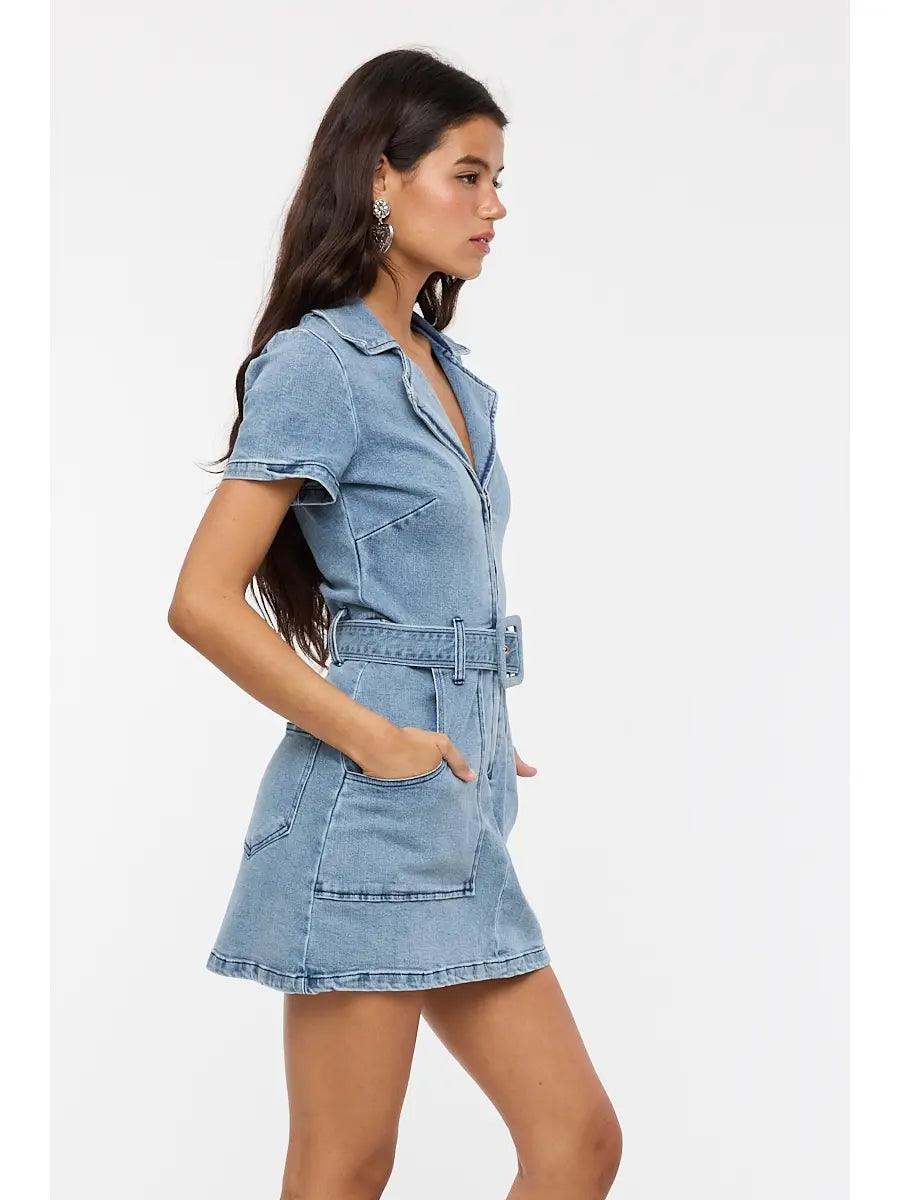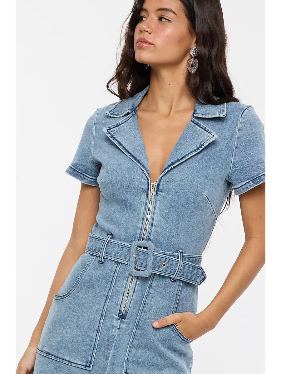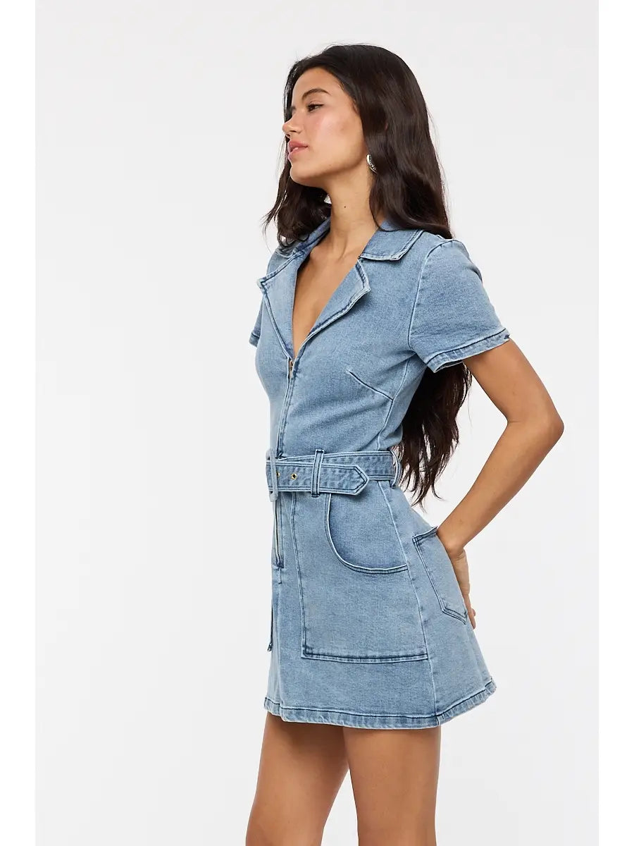 Your game day outfit just scored major points. The Tailgate Denim Mini is a must-have light wash denim dress with a flattering mini length, classic collar, and bold zip-front closure that lets you style it your way—zipped up, layered open, or somewhere in between.