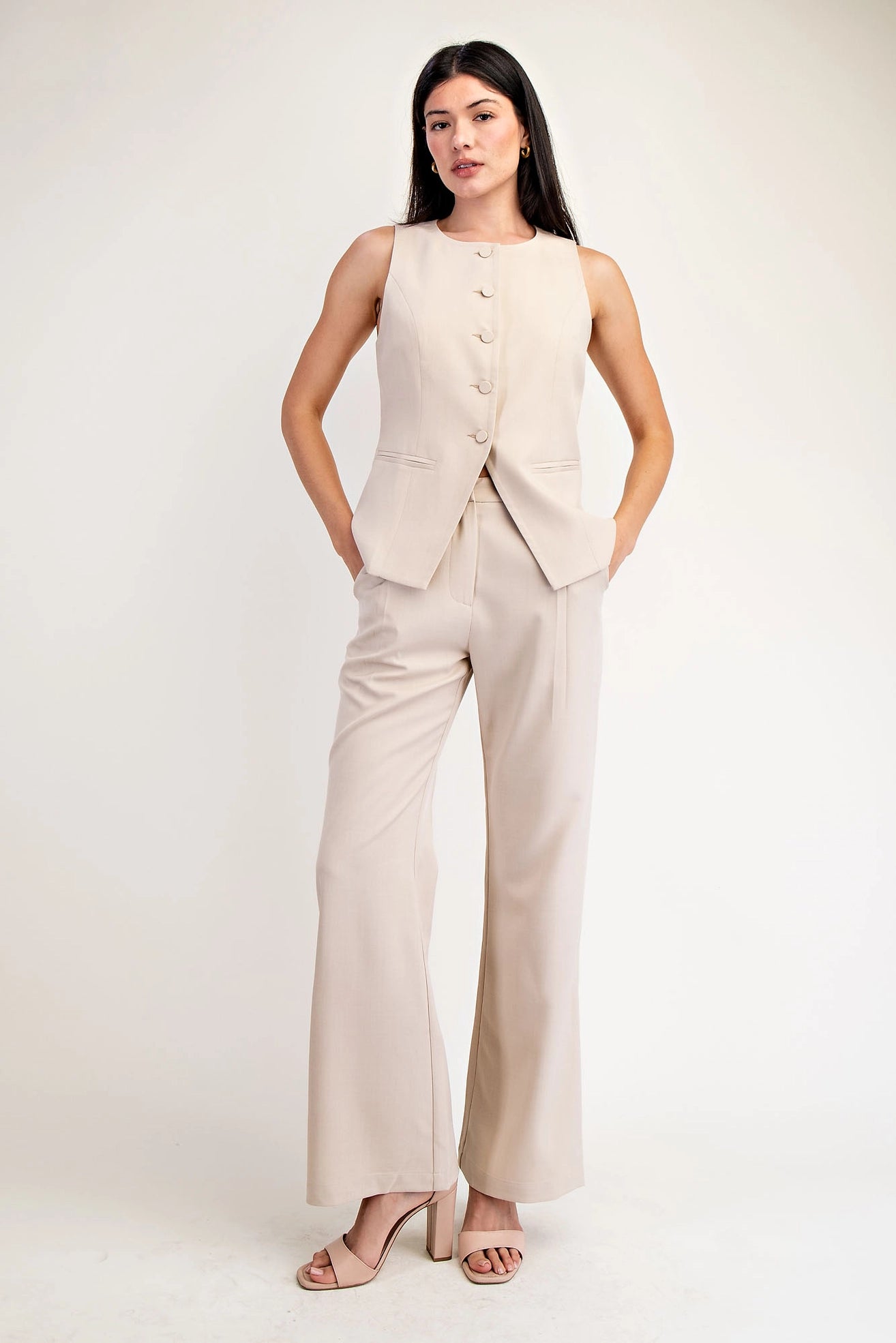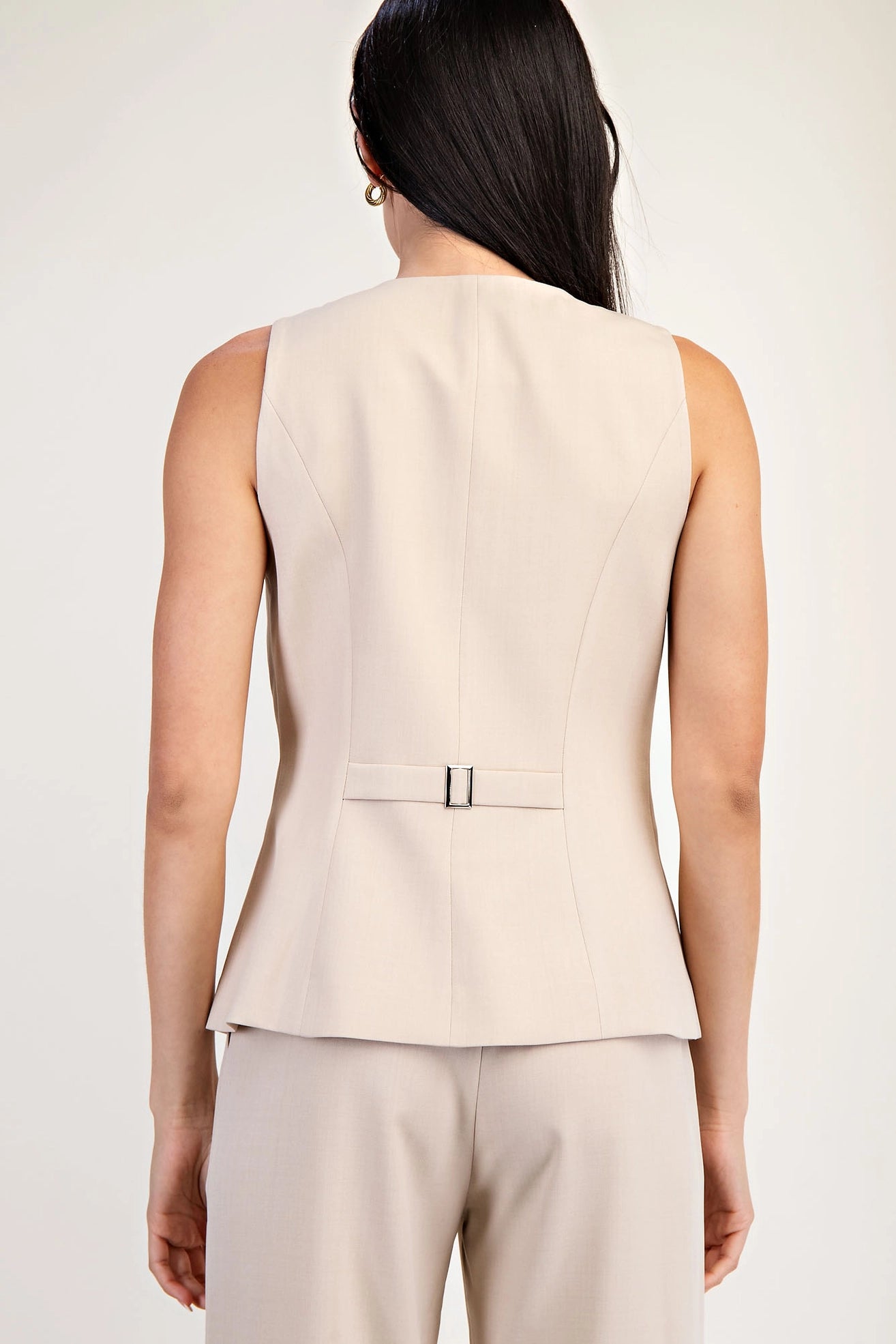Elevate your style with The Apex Woven Vest. This sleek, long-line design offers a sophisticated twist on the classic vest, crafted from high-quality woven fabric for a sharp, structured look. Adjustable back makes for a perfect fit. Perfect for layering, its versatile silhouette makes it an ideal choice for both casual and polished outfits.