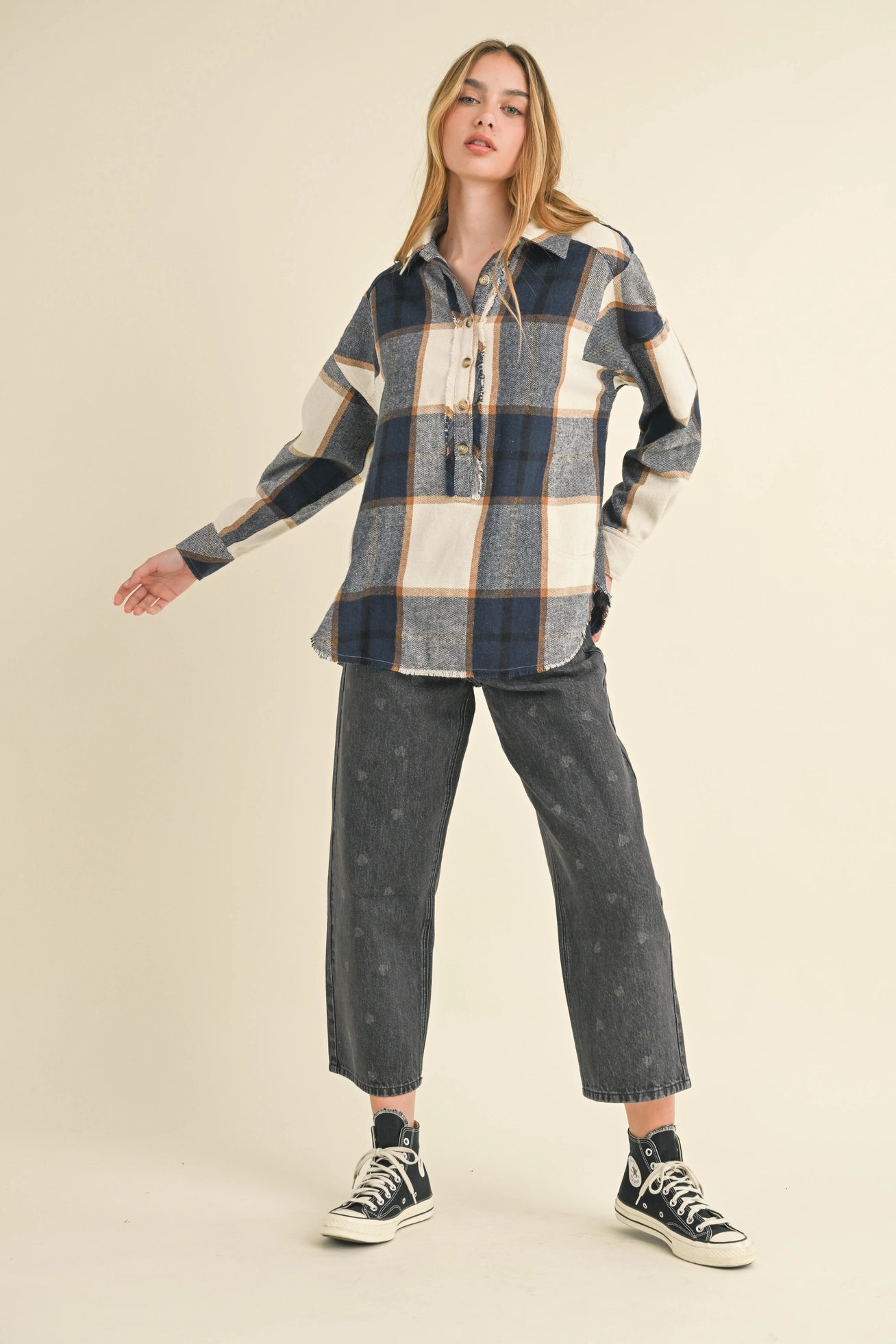 With a soft, brushed fabric that feels like your favorite flannel, this pullover top is designed with a relaxed fit, quarter-button neckline, and a front pocket for added ease and casual flair. Throw it on with your favorite jeans or leggings, and you're ready for the Blue Lot, bonfires, hayrides, or brunch.