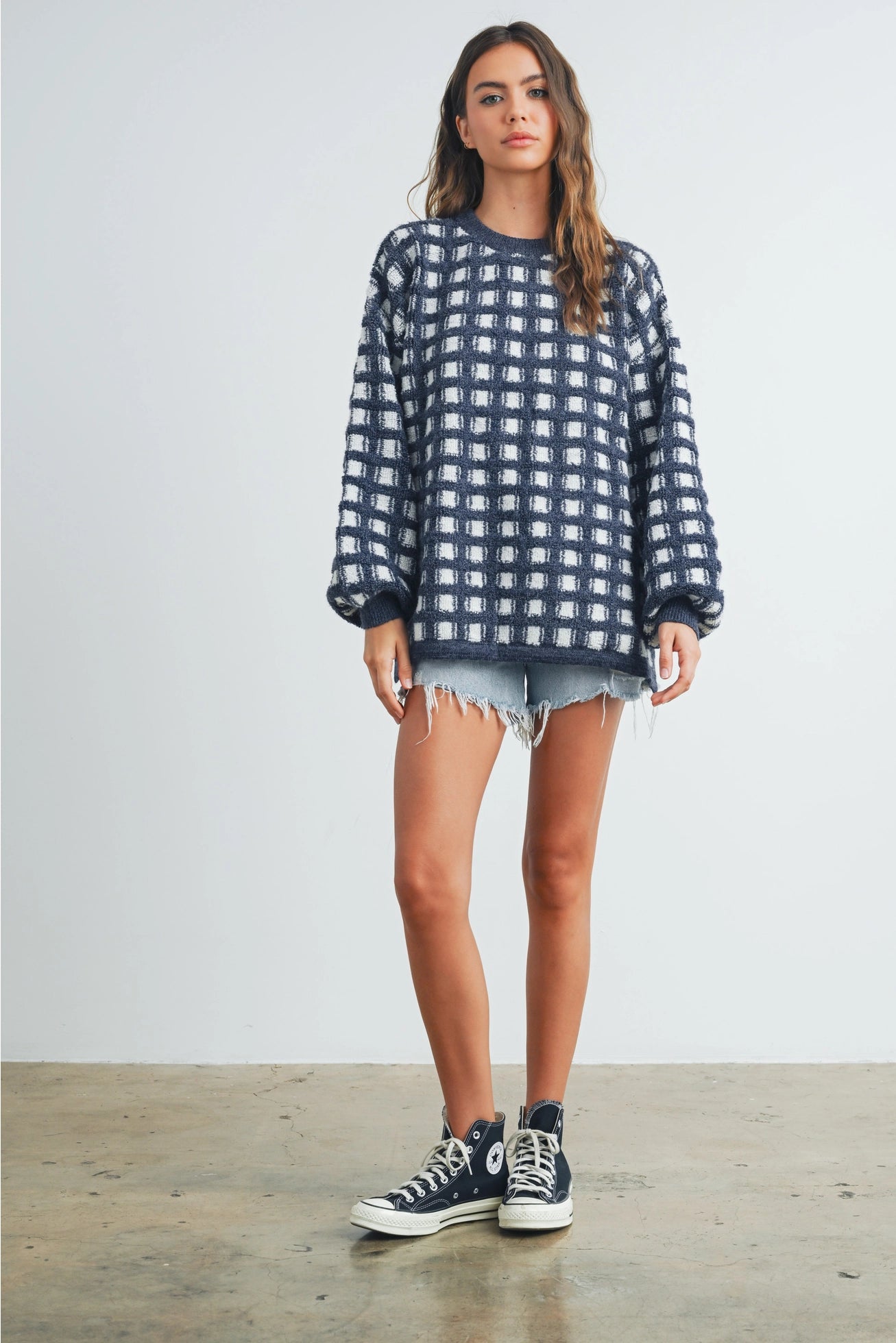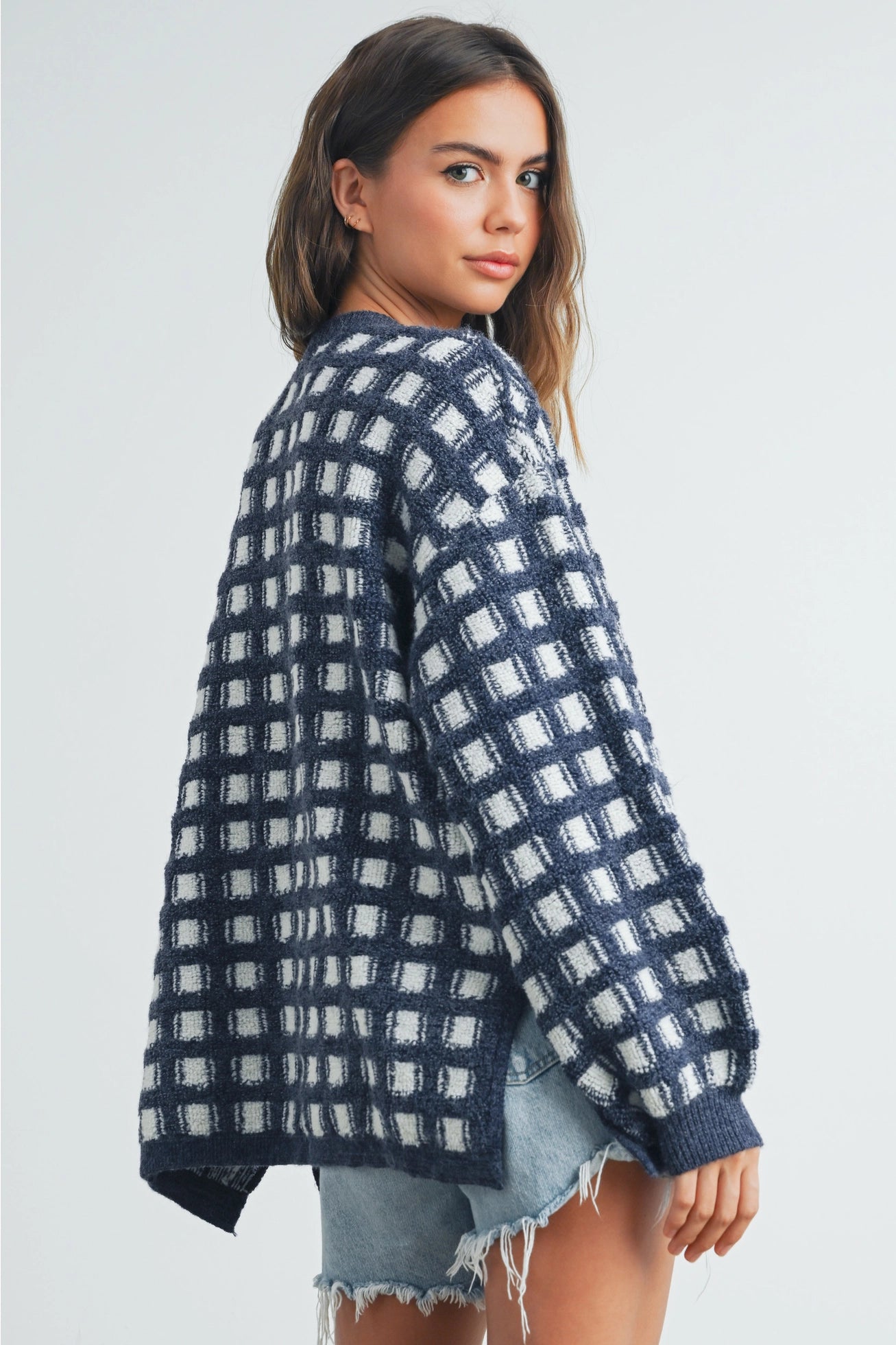 The Cozy Check Oversized Sweater - Navy/Ivory