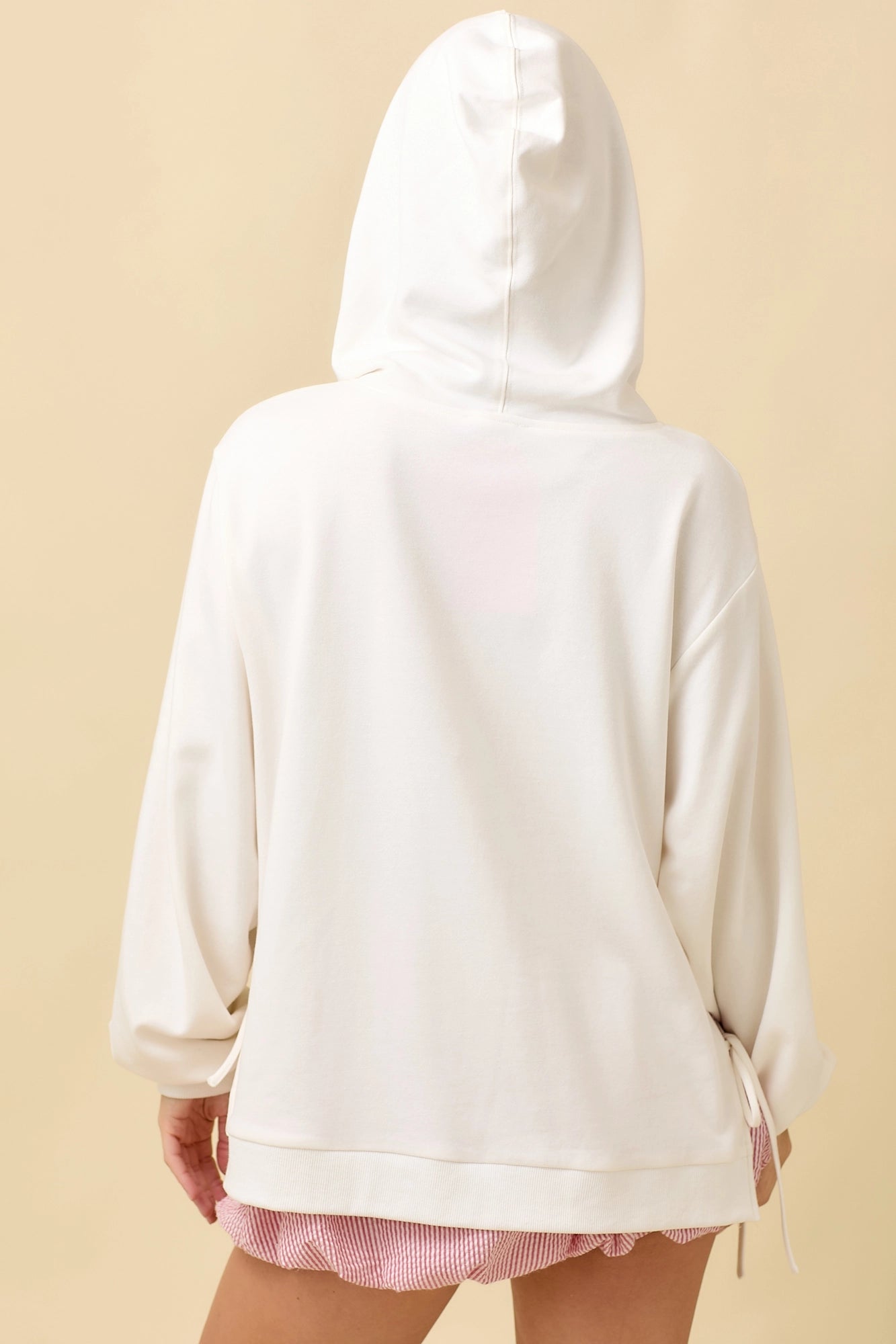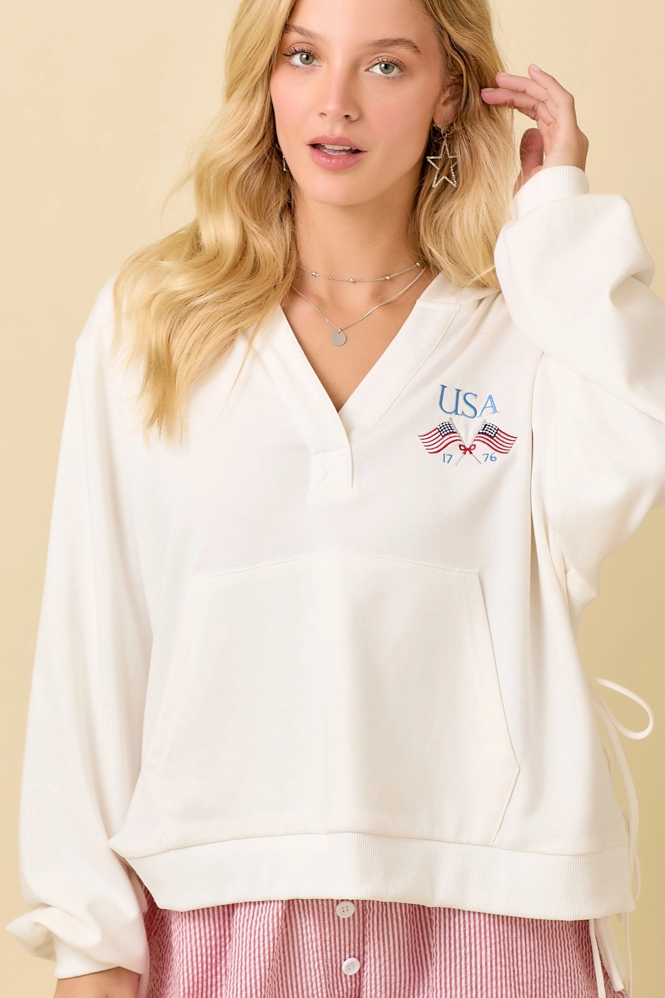 Wrap yourself in effortless Americana with The Liberty Lounge Hoodie. This oversized knit terry hoodie in a soft cream-white hue is the ultimate cozy-meets-cool piece for your year-round wardrobe. Featuring a charming patchwork American flag, a dainty “1776” bow detail, and side slits for easy movement, it’s made for the girl who loves her patriotic pieces with a fashion-forward twist.