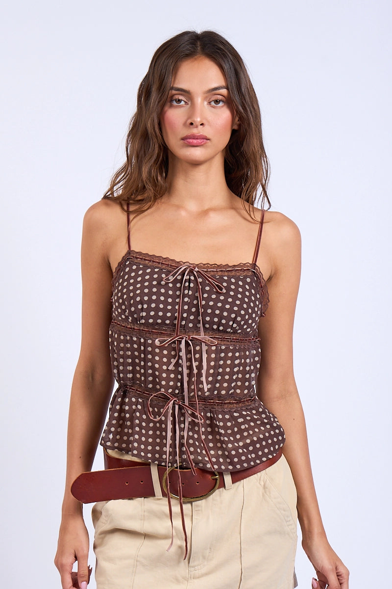 Meet The Love Language Cami — a dreamy mix of soft girl energy and modern-day coquette. Designed with delicate polka dot print, this triple-layered, ruched cami top features a flattering square neckline, lace trim, and a sweet front ribbon detail for that ultra-feminine finish.