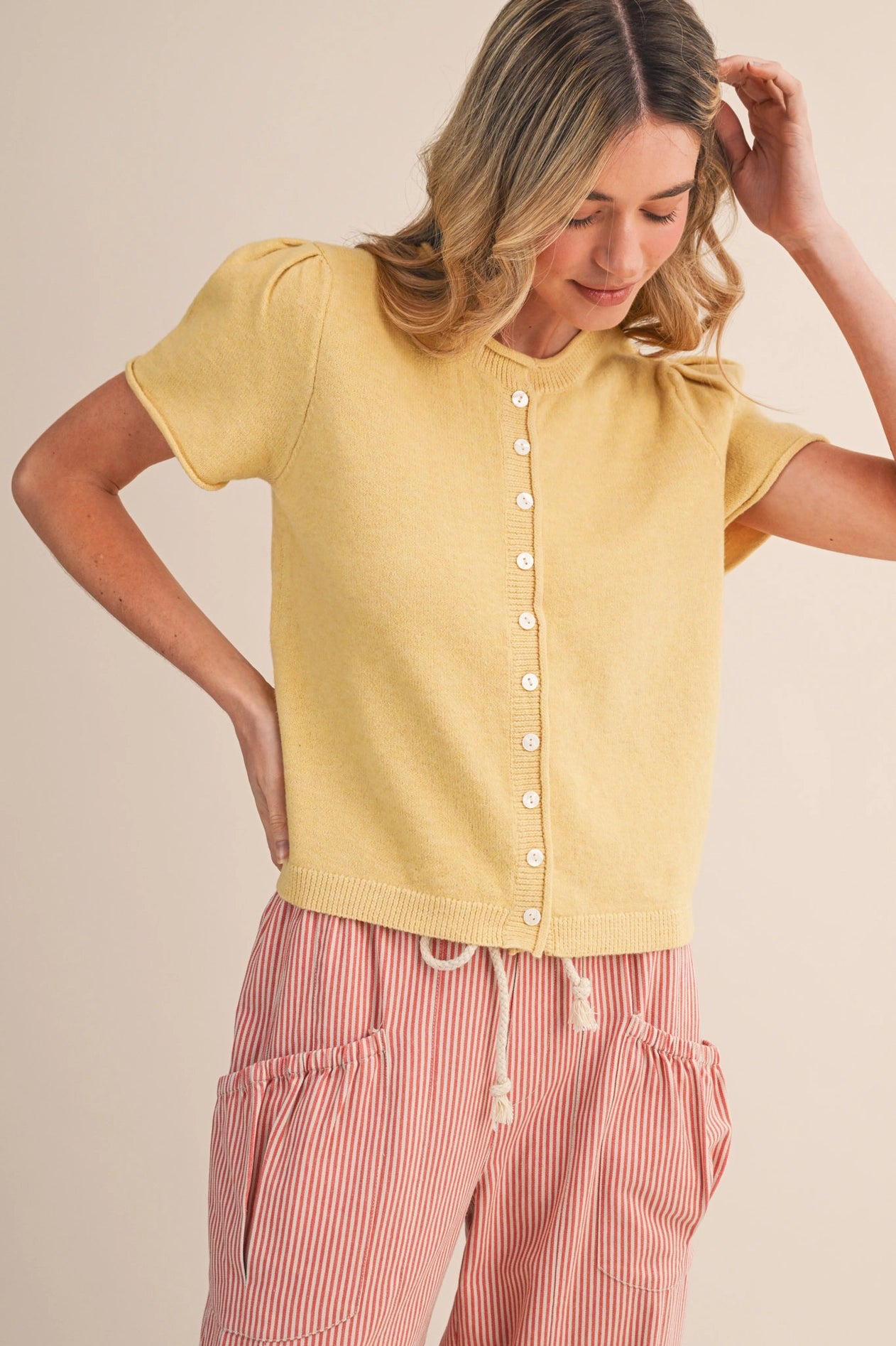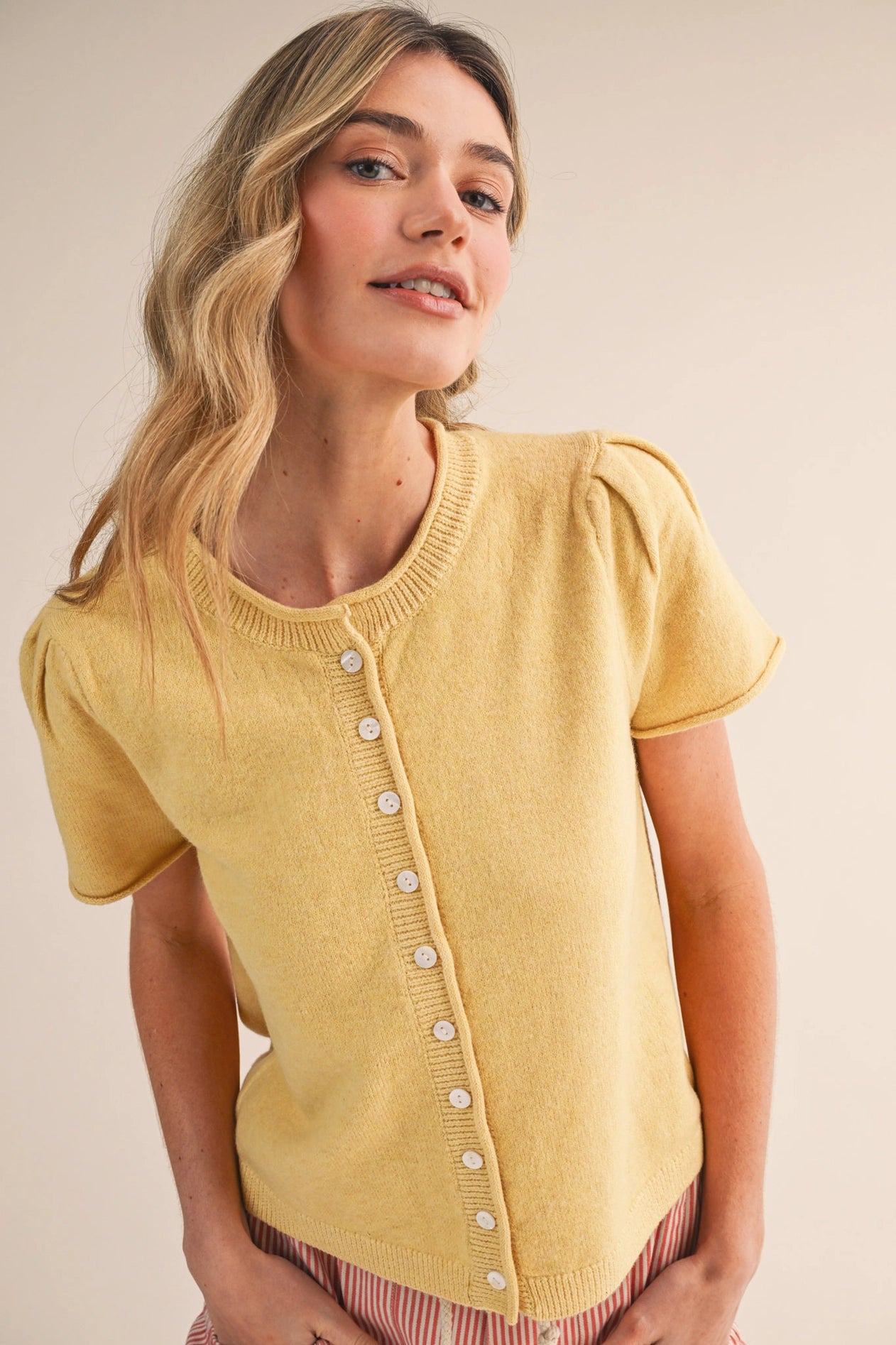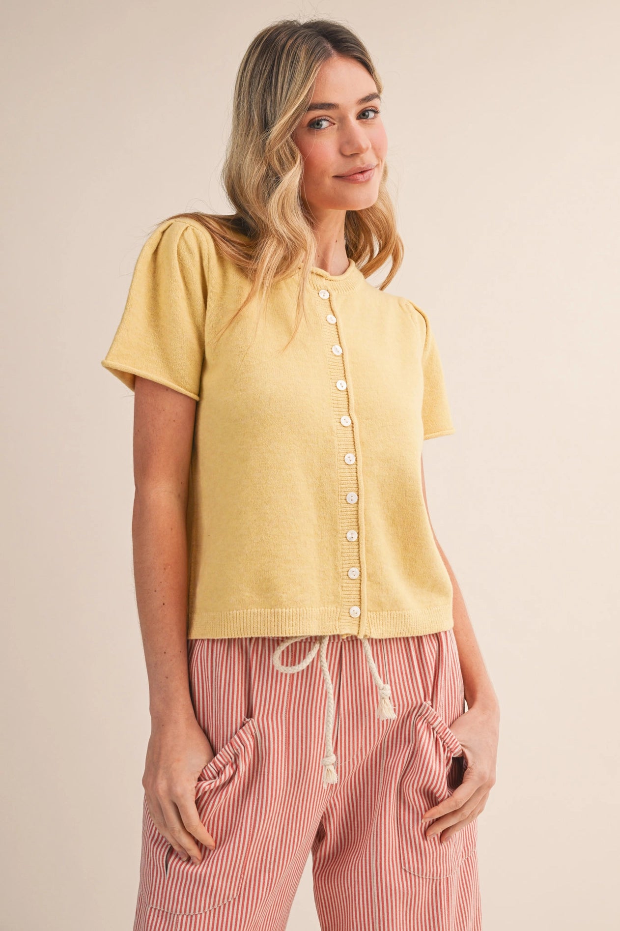 Soft structure meets effortless charm in The Luma Raw Edge Cardigan. Designed in a luminous butter yellow hue, this short sleeve button-up cardigan blends feminine detail with modern edge.