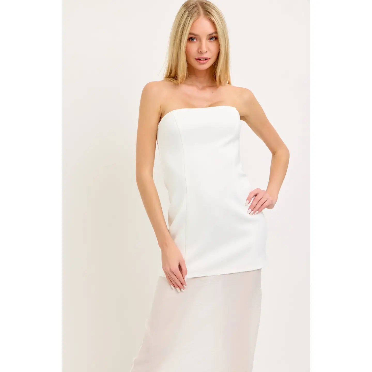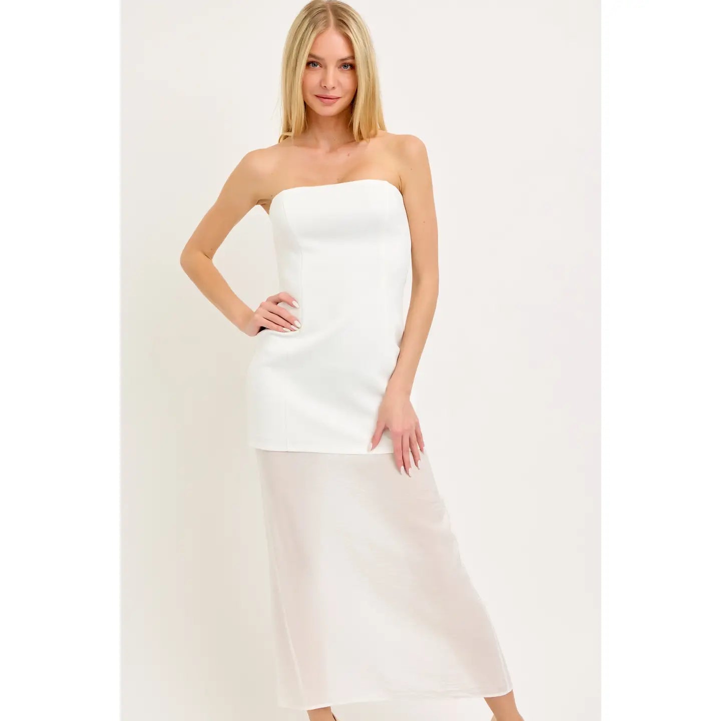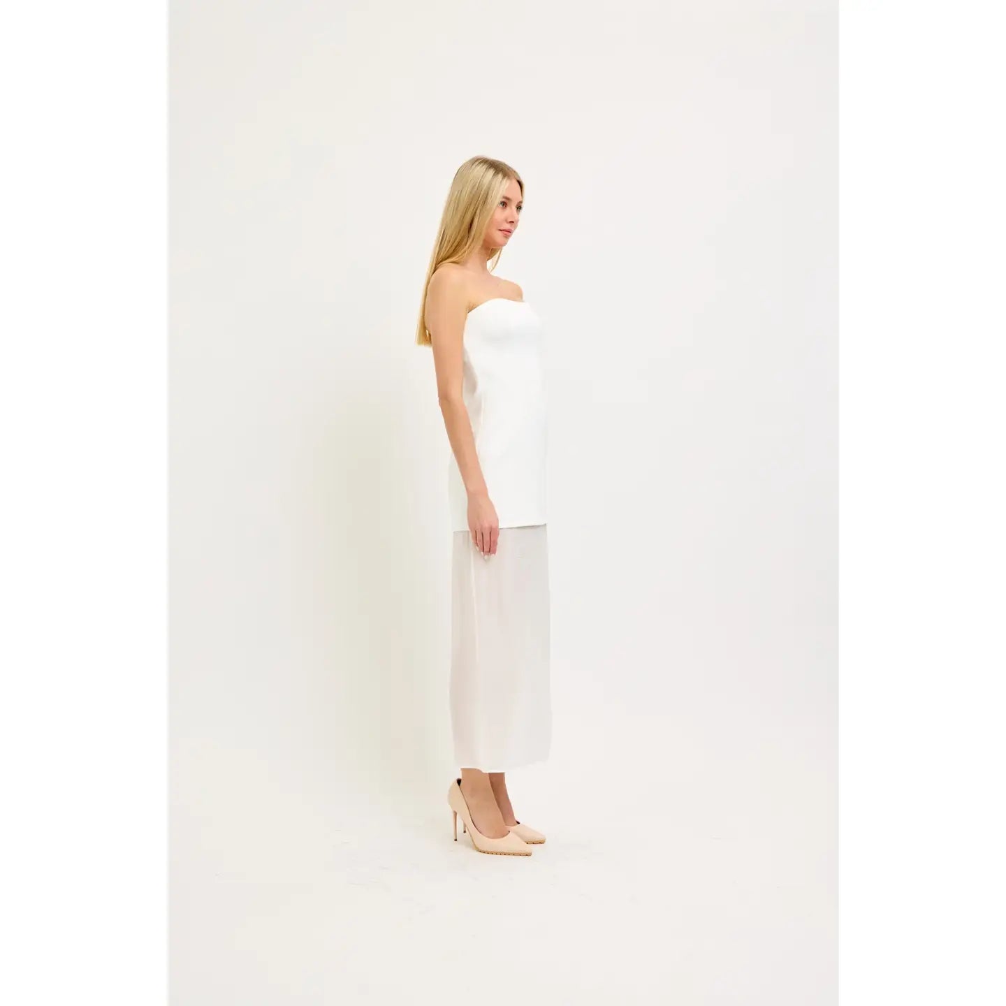 Elegant, effortless, and entirely unforgettable — The Marlowe Dress is your go-to white strapless maxi dress for everything from modern bridal looks to engagement parties, rehearsal dinners, and destination weddings. Designed with a sleek column silhouette, a structured strapless neckline, and a subtle contrast skirt detail for added movement and style, this dress combines minimalist bridal fashion with a cool, feminine edge.