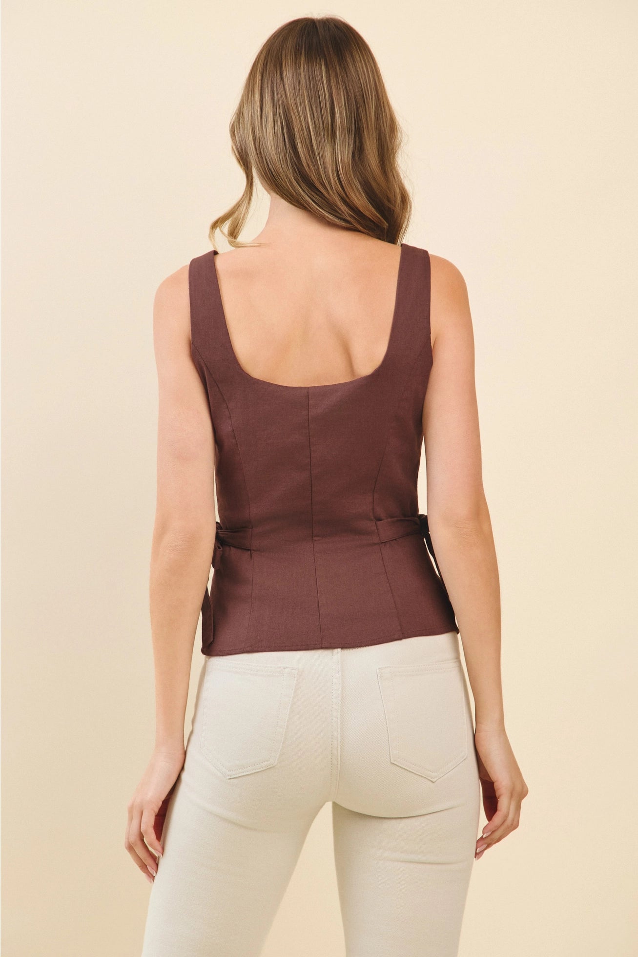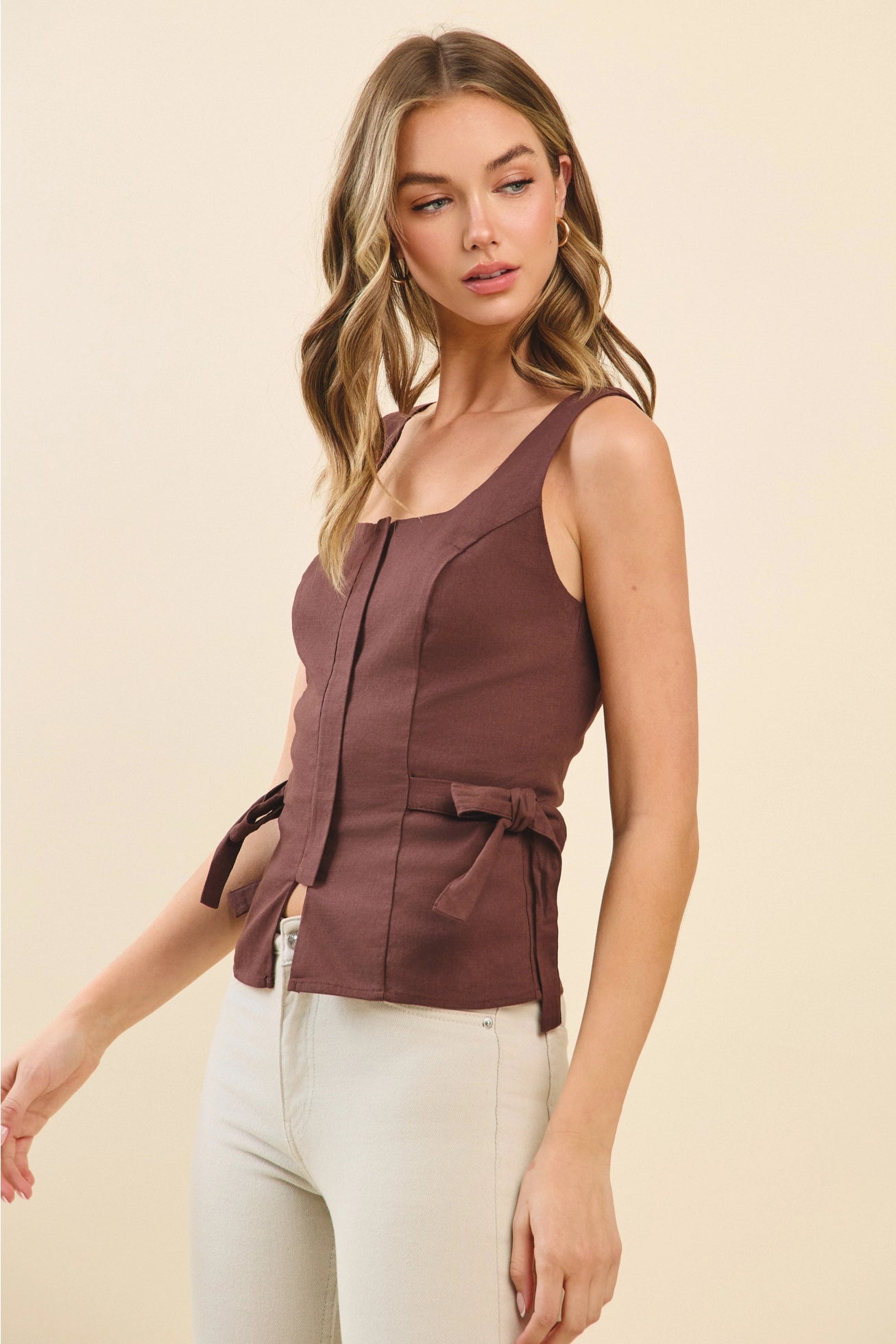 Designed with adjustable side self-tie accents, it offers a customizable fit that cinches perfectly at the waist, creating a subtly flared peplum hem that flatters every body type. Whether you're heading to brunch, the office, or date night, this versatile structured tank top is a must-have piece for effortlessly chic styling.