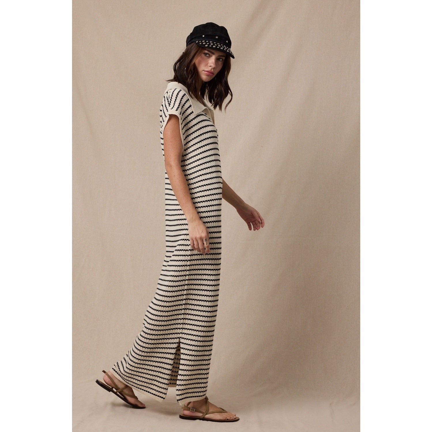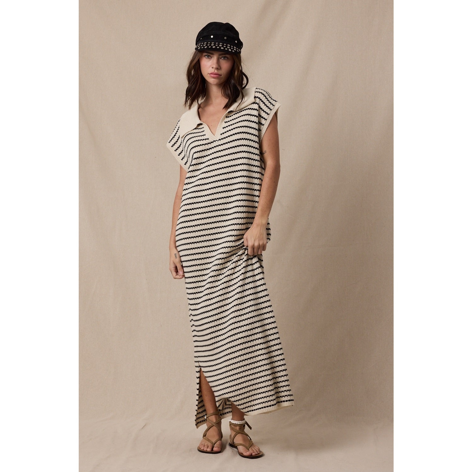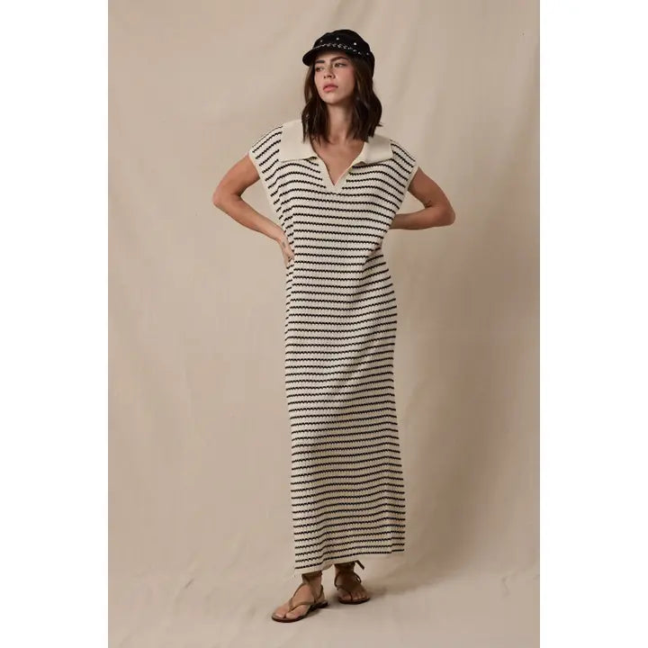 The wide collar and notched neckline add a modern touch, while the sleeveless cut keeps it breezy for spring and summer styling. Whether you're heading to a beach getaway, brunch, vacation dinner, or resort event, this striped crochet maxi dress moves with you beautifully.