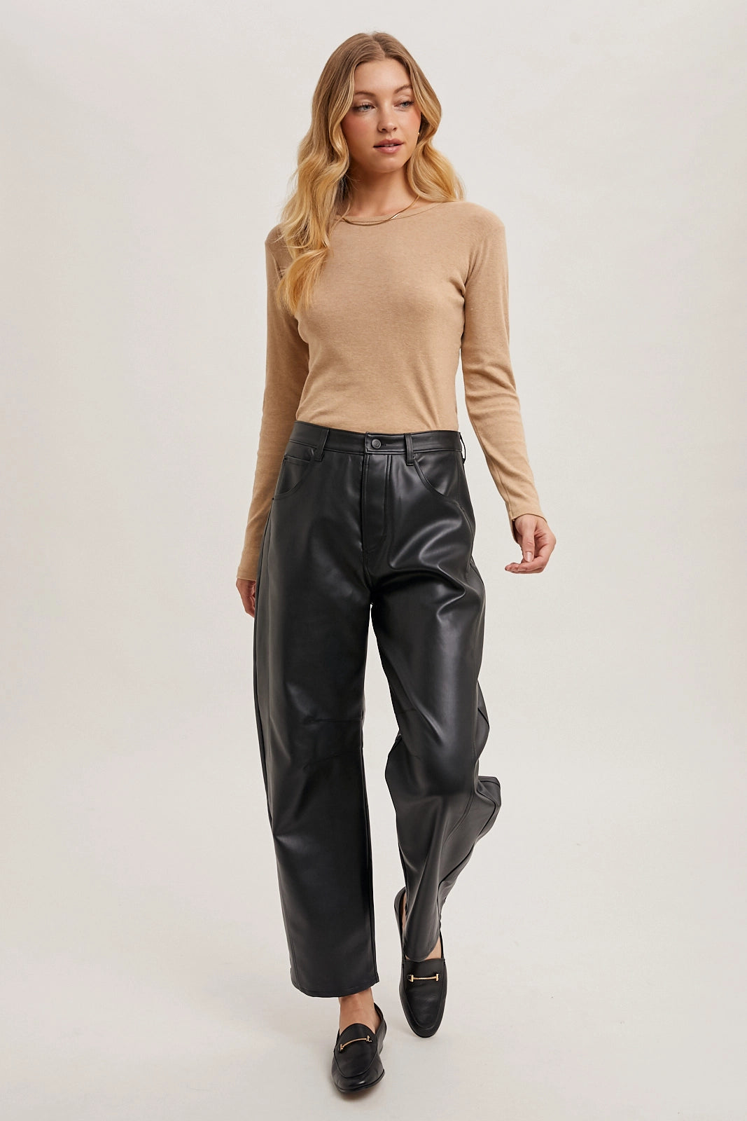 Bold meets modern in the Vegan Faux Leather Barrel Pant — a sleek, fashion-forward bottom that instantly elevates your fall wardrobe. Crafted from buttery-soft vegan faux leather, these statement pants feature a trending barrel-leg silhouette that tapers at the ankle for an ultra-flattering, sculpted shape.
