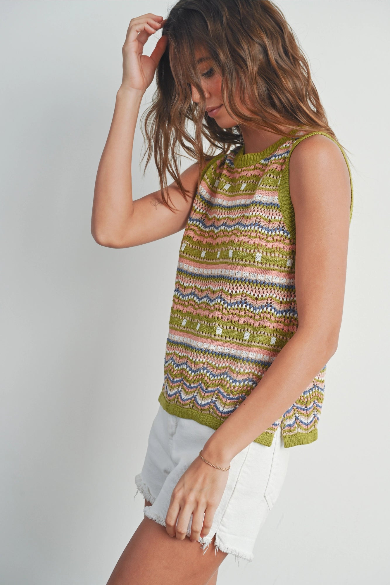 Introducing the Woven Spirit Knit Top—a stylish and versatile addition to your wardrobe that effortlessly combines comfort and modern flair. Crafted from high-quality knit fabric, this green sweater tank top features a bold geometric pattern that adds an eye-catching touch to any outfit. The relaxed fit ensures all-day comfort, making it perfect for casual outings or dressing up for a more polished look. Pair it with our white denim for a chic and trendy ensemble that’s perfect for any occasion. This top is your go-to for easy, effortless style with a contemporary edge.