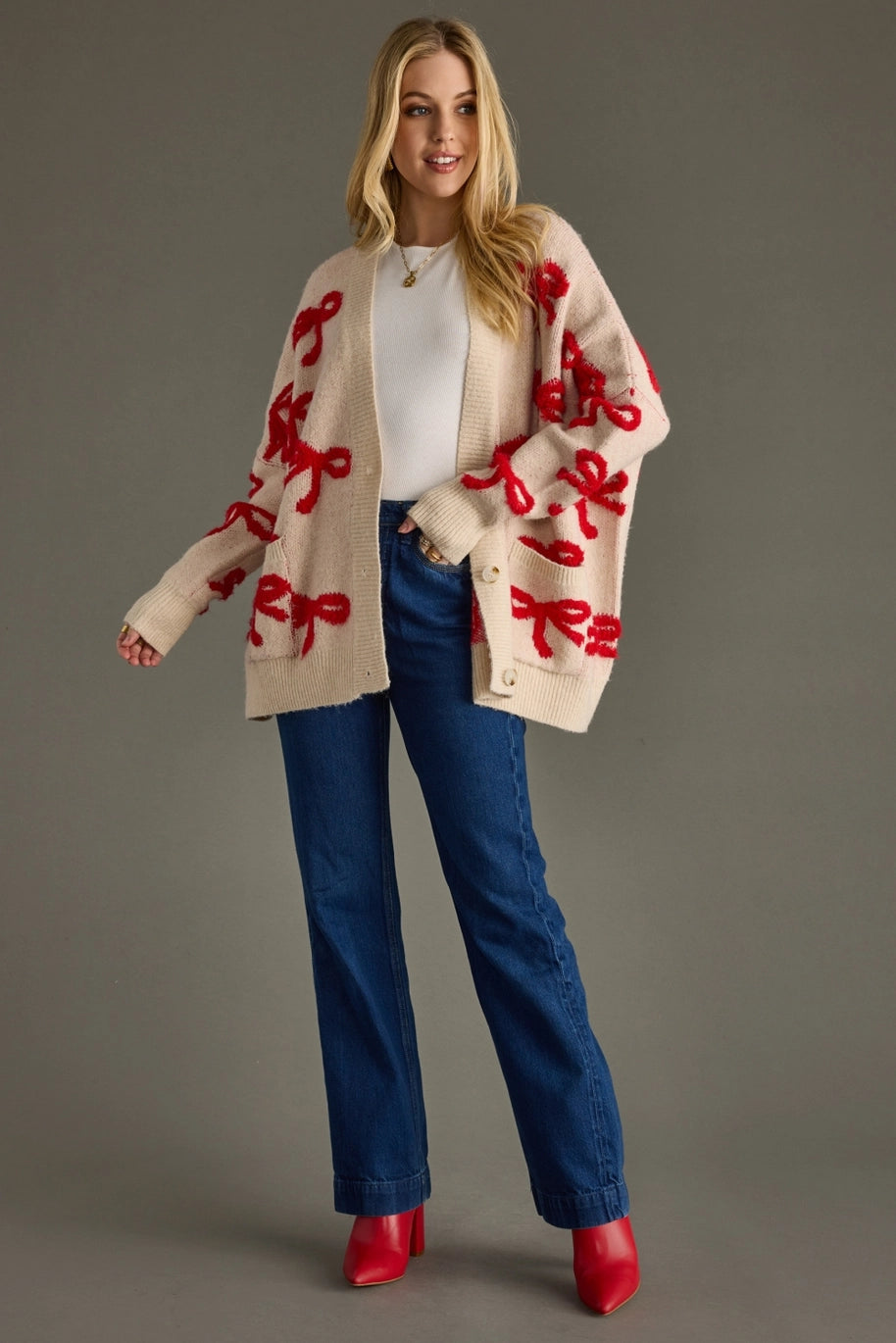 Wrap yourself in cozy elegance this holiday season with The Wrapped Up In You Cardigan, a statement piece that blends warmth, whimsy, and timeless charm. This ivory oversized cardigan features delicate red puff-stitched bows scattered throughout, creating a romantic, festive look that feels straight out of a classic Christmas movie.